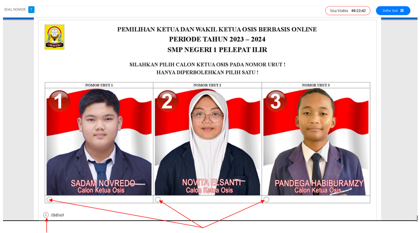 - Pada halaman Pertama siswa dipersilahkan memilih Calon Ketua Osis (Hanya bisa memilih satu Calon)