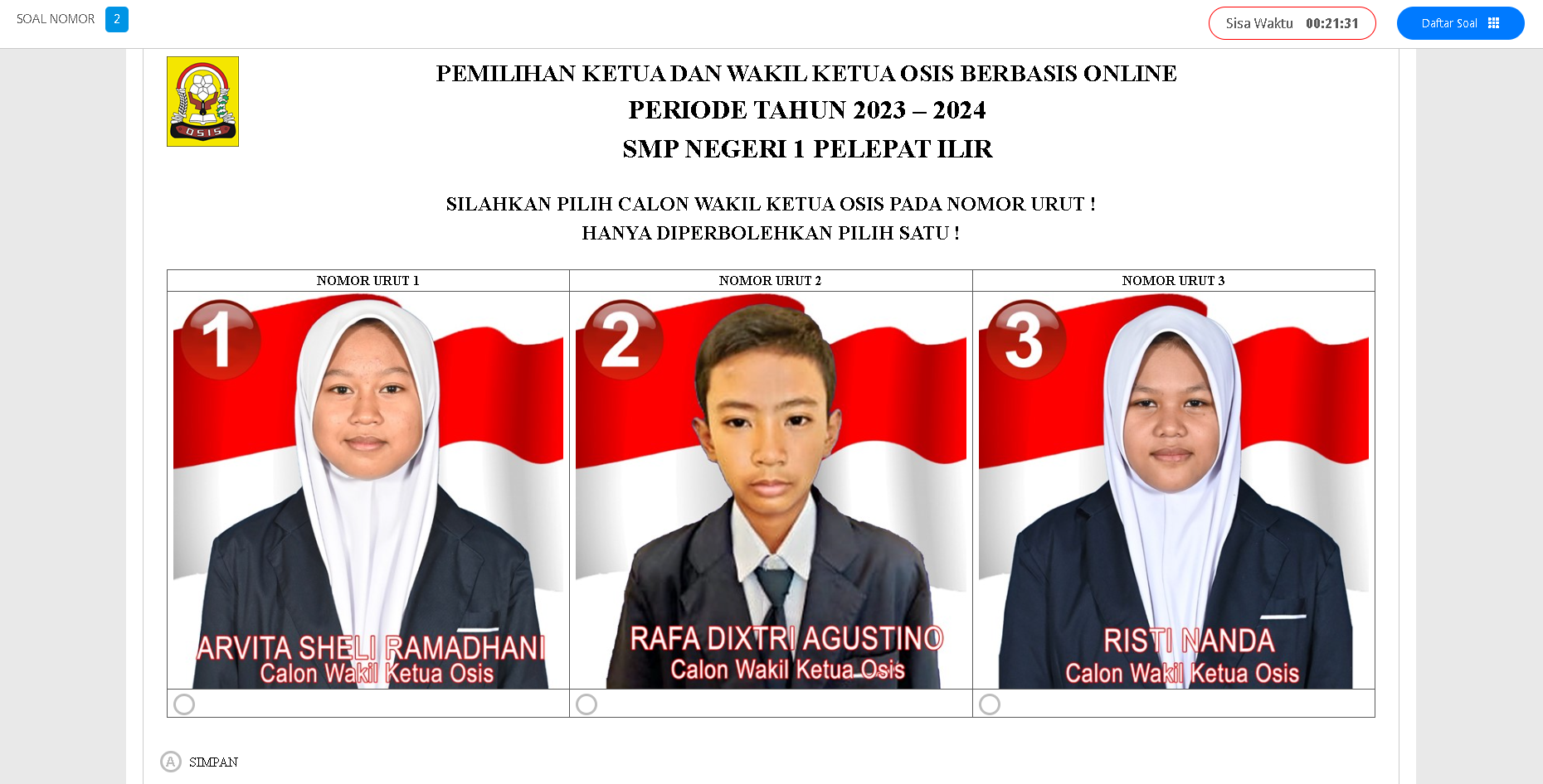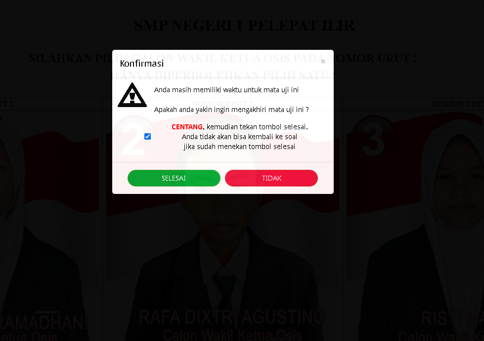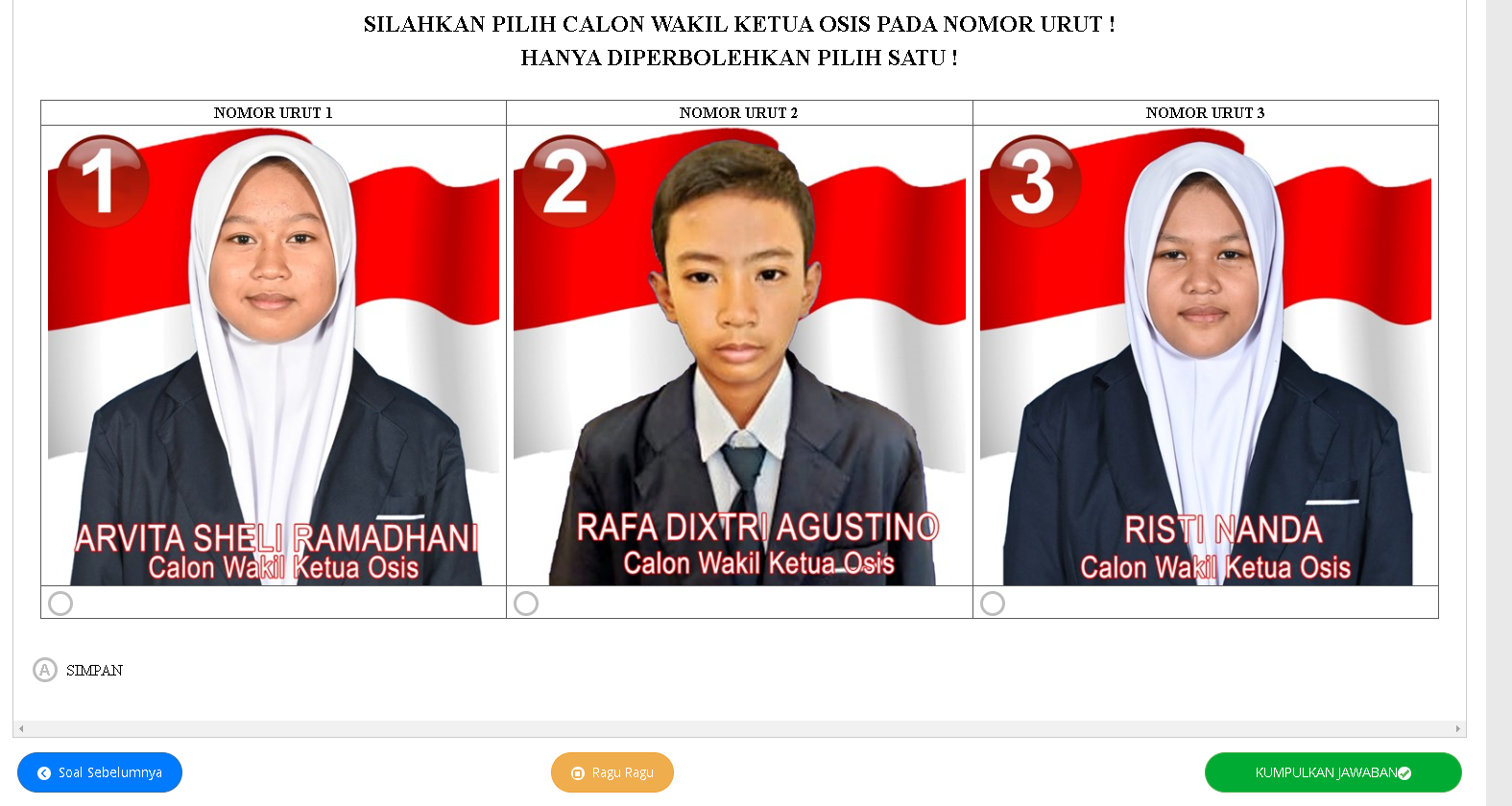 - Pada halaman kedua siswa dipersilahkan memilih Calon Wakil Ketua Osis (Hanya bisa memilih satu calon)