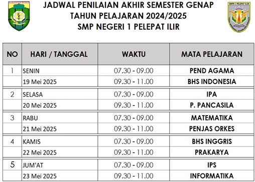 Tidak terasa waktu Ananda sebagai siswa/i SMP Negeri 1 Pelepat Ilir hampir berakhir dan Ujian Sumatif Akhir Semester (SAS) Genap kelas IX tahun ajaran 2024/2025 akan segera dilaksanakan.